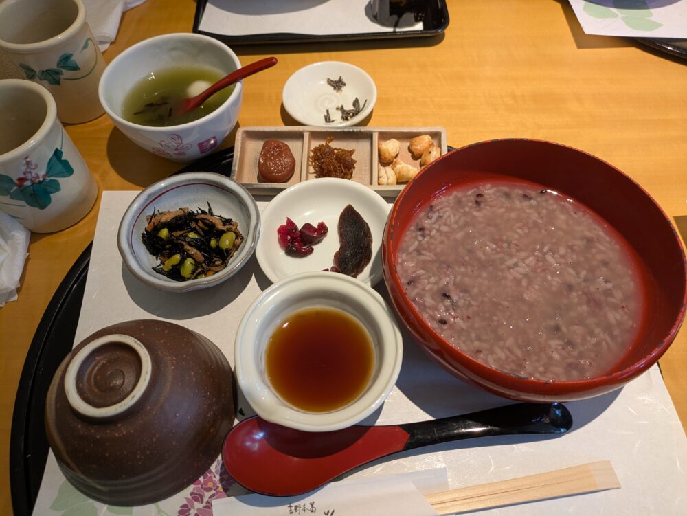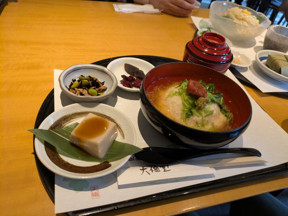初日のランチは葛の天極堂さん。東大寺の近くにあり予約不可で行列覚悟で行きましたが、並ばずに着席できました。葛うどんが有名のようですが、私は「葛がゆ」なるものを食しました。やさしい葛の仕立てがほっこりさせてくれます。箸休めに奈良漬けも二切れ食べました。