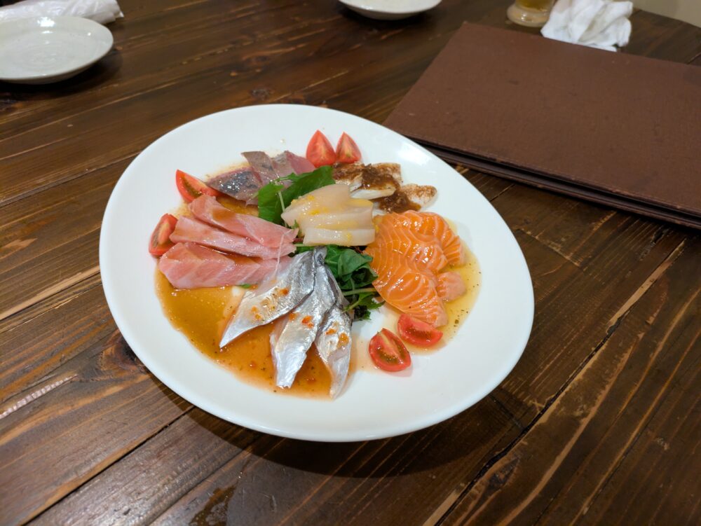 二軒目は、東京新橋にある立ち飲み「へそ」を見つけたので男性4人で飲みました。新橋は串揚げがメインですが、こちらは定食系のメニューがメインでした。大阪にもへそのお店があるそうで、メニューはそちらの流れなのかなと思いました。最後の1食だったそうめんがつるんとしていて、四人でいただきました。奈良のお店は比較的閉店は早く、夜は割と静かになりました。