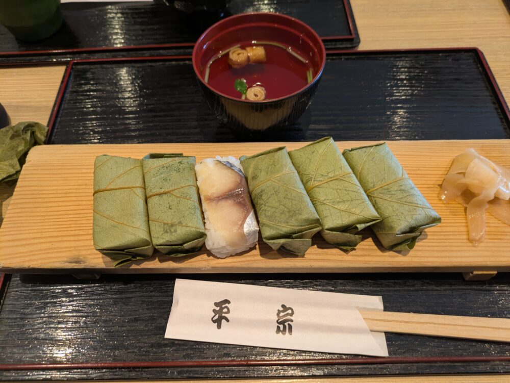 二日目のランチは柿の葉寿司の平宗さん。柿の葉で四角に握られた締め寿司です。